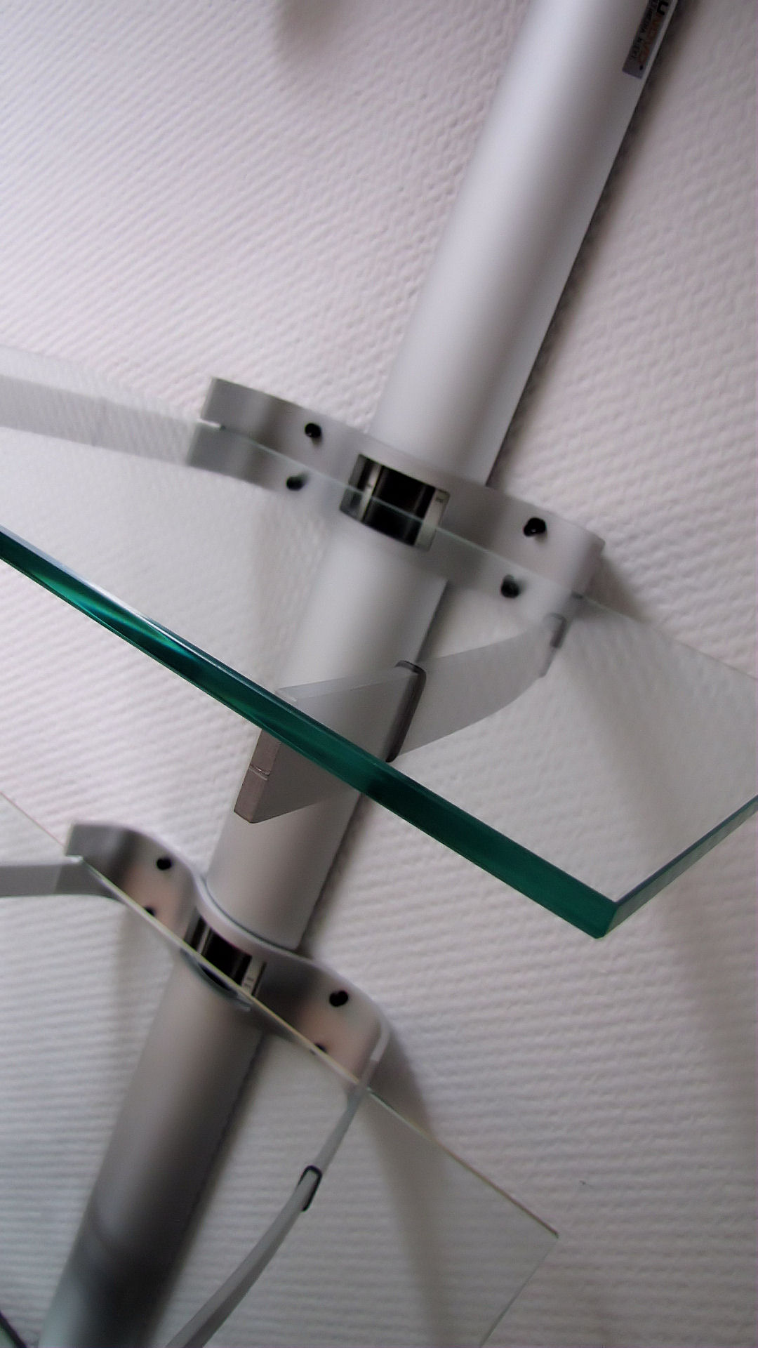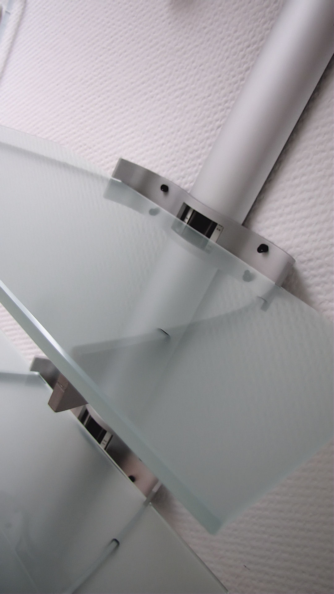 - 1 stuk glazen plank 50 cm x 30 cm van 8 mm dik veiligheidsglas (ESG) in helder glas, mat of glanzend zwart (graag kiezen). Alle randen zijn geschuurd, gefaseerd en gepolijst.
