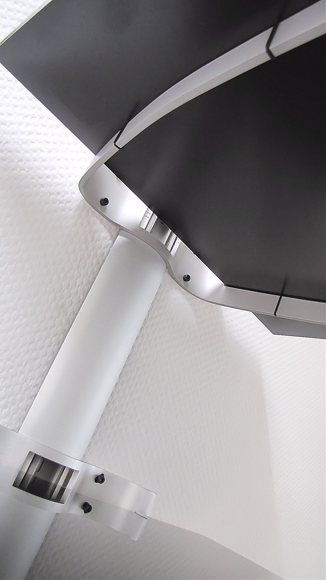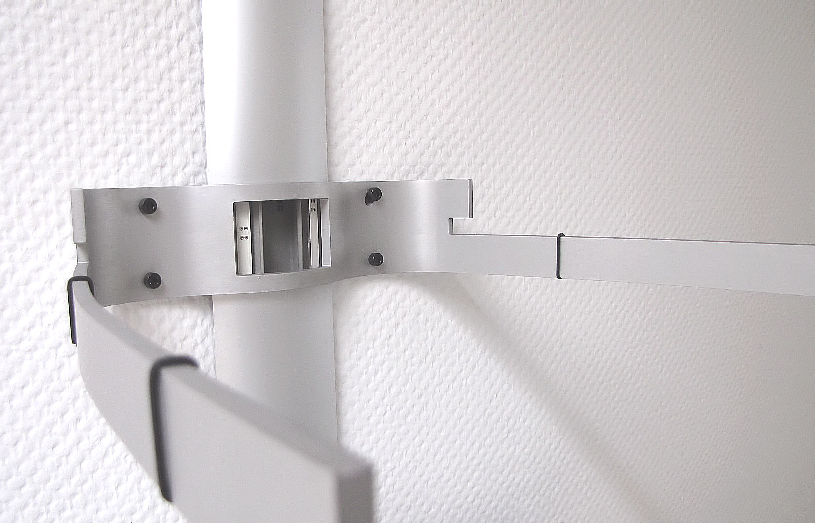 De ALUNOVO® Multimediahouder van hoogwaardig aluminium wordt eenvoudig met vier schroeven bovenop de kabelgoot bevestigd en kan tot wel 15 kg veilig dragen. De geïntegreerde rubberen stoppers voorkomen het wegglijden van de componenten. Om een opening in de kabelgoot te creëren, wordt alleen de ALUNOVO® kabelgootafdekking ter hoogte van de multimediahouder met een standaard ijzersnijder (PUK-zagen) doorgezaagd. Hierbij hoeft niet zeer precies te worden gewerkt, want de 10 mm dikke zichtbescherming van de multimediahouder verbergt de zaagsneden van de kabelgoot. De kabels van het te plaatsen apparaat kunnen dan direct in de kabelgoot worden geleid en daarmee worden verborgen.